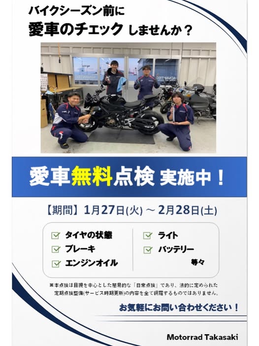 バイクシーズン前に、愛車の健康診断しませんか?【愛車無料点検】はじまります☆1月27日(火)〜2月28日(土)☆タイヤ・ブレーキ・オイル・ライト・バッテリーなど簡易的な日常点検ですので、お気軽にお立ち寄りくださいご来店お待ちしております!!